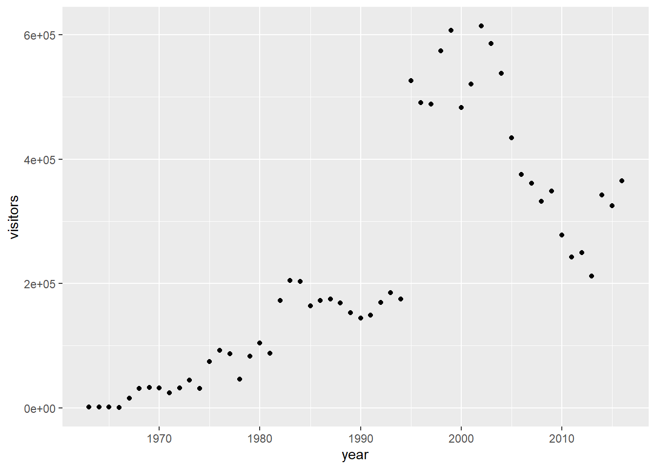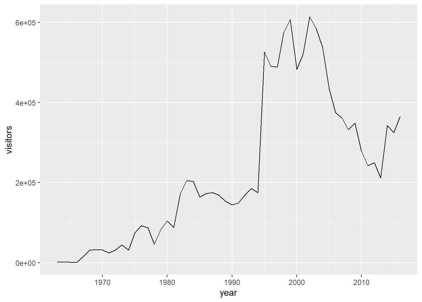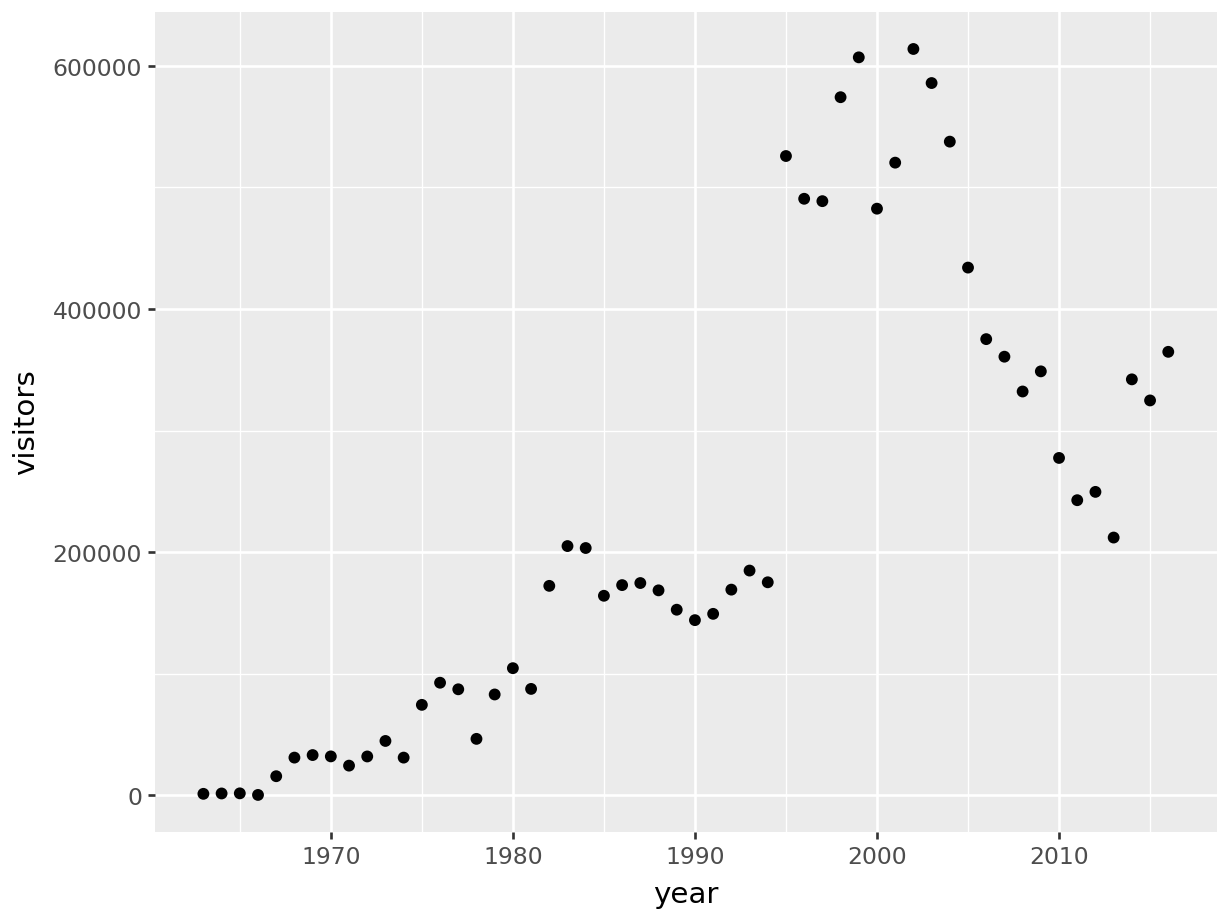 import matplotlib.pyplot as pltfrom plotnine import ggplot, aes, geom_lineplt.switch_backend('agg')# Creating the plotplot = ( ggplot(data=ci_np, mapping=aes(x='year', y='visitors'))+ geom_line())# Displaying the plotprint(plot)